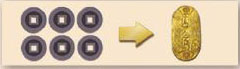 You may exchange your six mon with one koban. You may exchange them up to two kobans. Two kobans are equal to twelve mons.