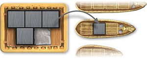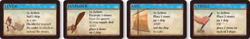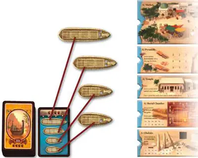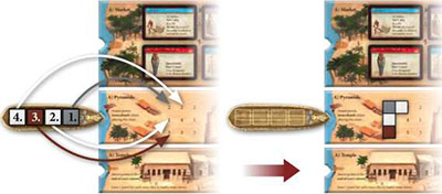 Example: This four-stone ship was sailed to the pyramid. Beginning with the stone closest to the front, all the stones are now placed on the pyramid. The pyramid yields points immediately for each stone delivered, in accordance with the number value indicated on the space.
