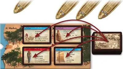 - Gather up any market cards still remaining on the market board and place them on the discard pile.