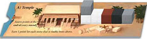 Example: The temple is assessed at the end of the round. Here, the gray player gets 2 points (for 2 stones visible from above). The white, brown, and black players get 1 point each (each for 1 stone visible from above).