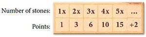 The burial chamber is unrestricted in the rightward direction. In other words, there can be as many columns as you like, even if you have to go to the end of the board. At the end of the game, points are earned as follows: Each area consisting of one stone or more than one connected stones of a single color yields a certain number of points depending on the number of stones.