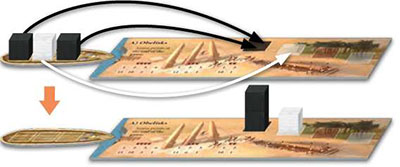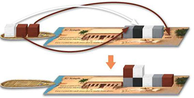 Example: This four-stone ship was sailed to the market. The white player can first take a card and she selects the sail card. Then the brown player chooses the statue card. Then the gray player chooses the lever card. By the end, all of the stones that were on the ship are returned to the quarry.