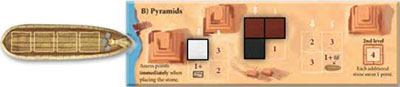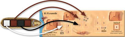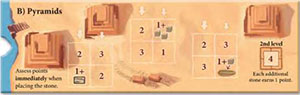 Each stone in the second level of a pyramid is worth4 points. Once the pyramids are completed, each additional stone delivered to the pyramids yields 1 point. Place these stones at the right edge of the pyramid board.