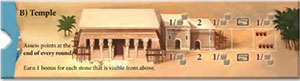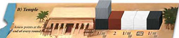 Example: The point assessment for the temple is performed at the end of the round. The gray player can decide whether to take 1 point or 2 stones from the quarry. The brown player gets 2 points. The white player gets to decide whether to take 1 point or 2 stones from the quarry. In addition, the white player gets to take the top market card from the draw pile. The black player gets to decide whether to take 1 point or 2 stones from the quarry.