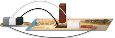 Example: This 3-stone ship was sailed to the obelisks. The black player places his stone on one of the empty spaces on the board. The white player adds her stone to the other two white stones. Since there are now 3 white stones at the obelisks, these stones are stacked into a tower on the next free space (with a point value of 9).