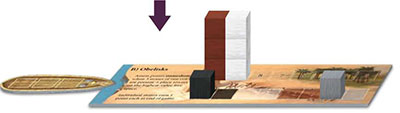 Example: This 4-stone ship was sailed to the pyramids. The brown player places her first stone on the first space of the middle pyramid. Then, the black player places his stone on the second space of the middle pyramid. Then, the brown player places her second stone on the third space of the middle pyramid. Finally, the white player places his stone on the first space of the left pyramid.