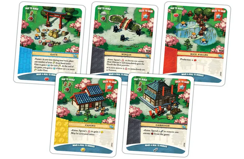 If razed, Japanese Faction Locations are not turned into a Foundation, but discarded instead. The Japanese player can also use his Workers as Samurai to protect his Faction Locations.