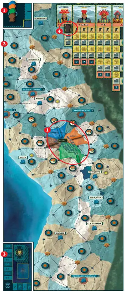 All players place their Inca on the start space of the scoring track, and then place one of their wooden sticks on the road in their starting region (the road between Cuzco and their start location).