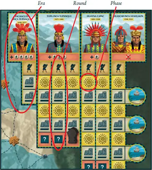 The black Inca figure indicates which round and which phase is being played. If all players have completed a phase, the Inca figure moves down one field. When the bottom-most field is reached, the Inca figure is returned to the top-most field of the next column and a new round begins.