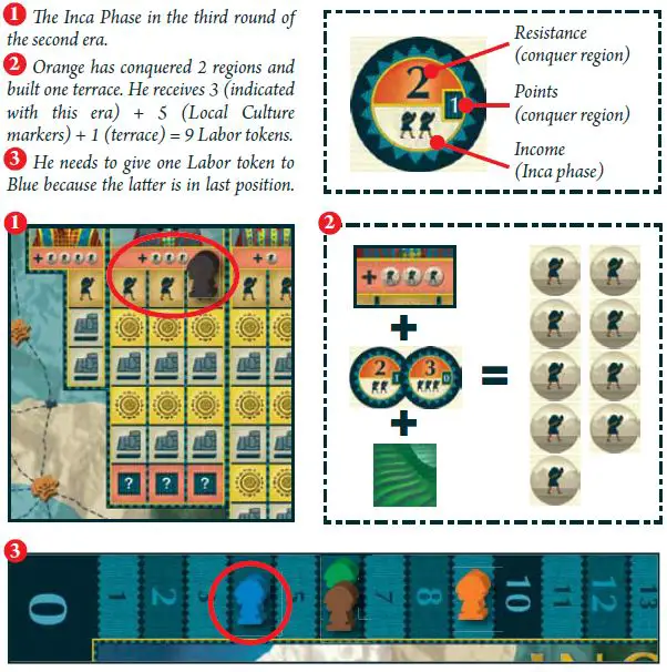 The Inca Phase represents the activity and production of the empire. Labor tokens represent the labor each individual provides the empire. This labor tax or "mit'a" was usually a specific amount of time each year.