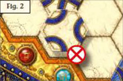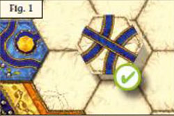 The player places his route tile on any unoccupied space. The tile can be placed by itself or next to any occupied spaces (fig. 1).