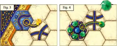 From the bordering treasure tile (fig. 3), he moves the yellow amber that is located there. From the treasure tile in the middle {fig. 4), one of the green emeralds is moved until only the blue sapphire is left This is the last gem to be moved from the treasure tile (like all the others; by placing a route tile).