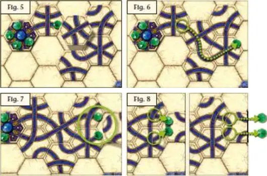 If the tile that has just been placed extends a route that already has a gem on it (fig. 5), the player moves it to the new end of this route (fig. 6). The gem must always follow the course set by the route. This means it can never "turn" on a tile or move backwards. If there are several gems beside the new route tile, then they are all moved (fig. 7).