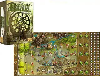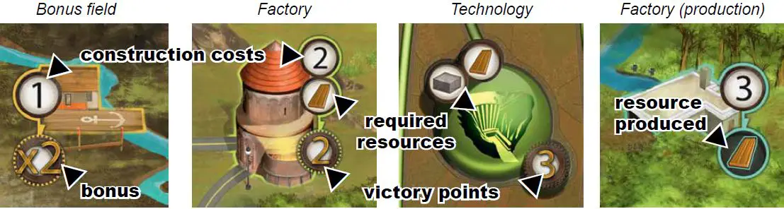 Money is tight, so plan the development of your industrial empire with care. At the end of the game, certain combinations of Factories, Technologies and Bonus fields will bring their owner valuable bonus points.