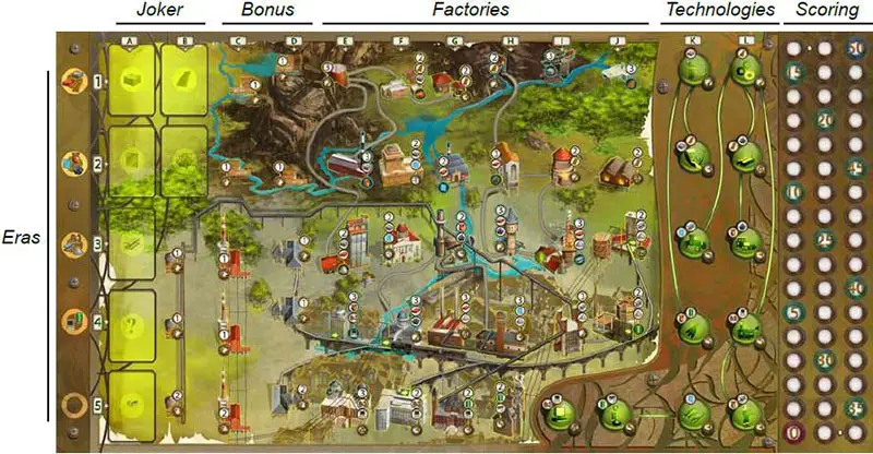 Place the game board in the center of the table. Place the Era token on its space in the 1st Era. Place the Joker tokens face-up on the indicated fields of the board.