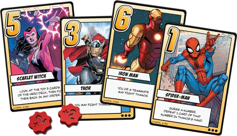 Nebula / Spider-man / Star-LordGuess a number. If Thanos is holding a card of that number, defeat it.