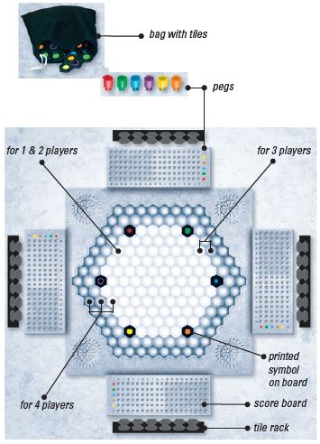 Each player has six tiles with color symbols on his rack. In clockwise order, players play one of their tiles onto the board with the objective of establishing lines of matching symbols emerging from the placed tile.