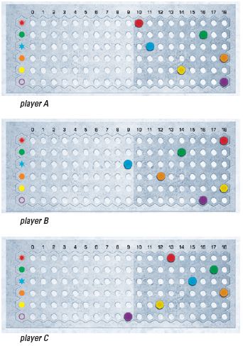 Each player displays one score board in front of him and places one peg of each colour in the hole to the right of the colour symbols (value 0).
