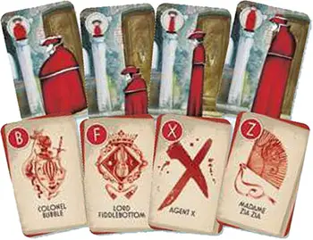 In the standard 4-player game, each player guides one of four secret agents. The four characters are allied in pairs: Lord Fiddlebottom and Colonel Bubble are always partnered against Agent X and Madame Zsa Zsa.