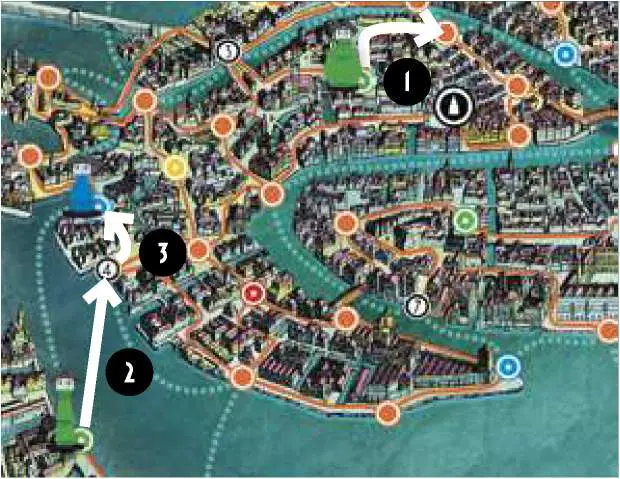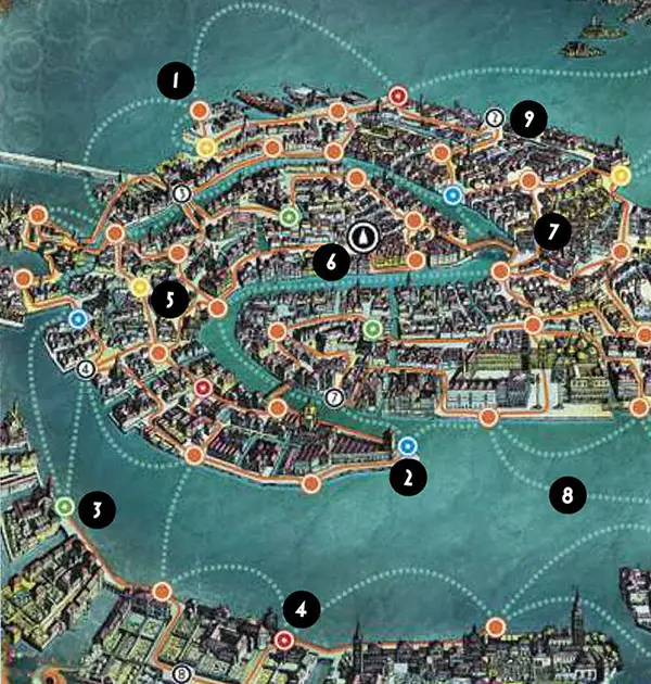 The game board represents a map of Venice, with its islands and its channels. Highlighted on the map are important game elements: