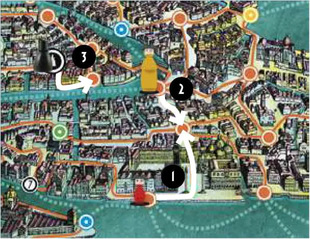 In their turn, each player shakes the Phantom of Prophecy randomizer to determine his three available actions. For example, moving on a land route or a sea route. The player moves his figures, trying to reach spaces already occupied by the other players' figures or the Ambassador.