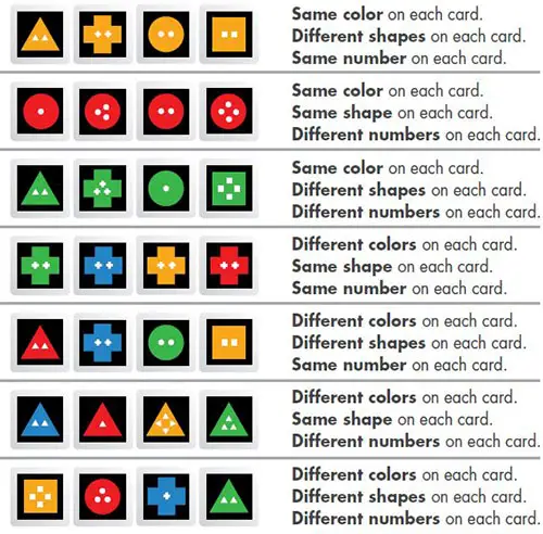 Since any 2 cards have some or no properties in common, any 2 cards will work to begin a line. The 3rd and 4th cards in that line must satisfy the requirements set by the first 2 cards.