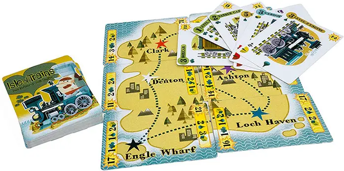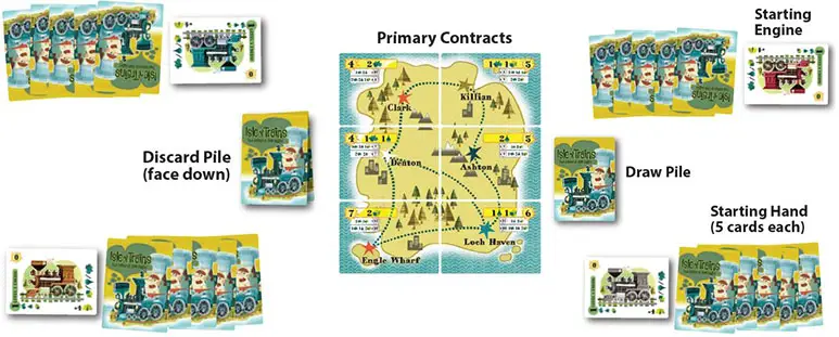 - The 6 Contract Delivery Cards are placed in the middle of the table, primary side up, forming the Isle of Trains.