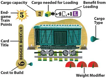 Cards are used in multiple ways: they can be built as train cars or buildings supporting your train line, used as currency to pay the cost of building new train cars and buildings, or used as cargo to load on available train cars.