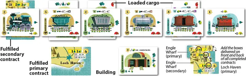 When claiming a primary contract, players must be able to fulfill the whole contract with the cargo currently loaded on their train. Discard the cargo cards and claim the contract card by placing it in the player's area.