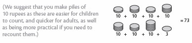 NB: the value of a bonus is not known until it is drawn. For 3 cards sold, it will be 1, 2 or 3 rupees. For 4 cards sold, it will be 4, 5 or 6 rupees and for 5 cards sold, it will be 8, 9 or 10 rupees. Unlike the goods tokens, the rupee value of the bonus token is only printed on the back (hence the question marks on the front).