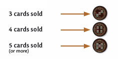 To sell cards, choose one type of good and discard as many cards of that type as you like onto the discard pile. Each sale earns goods tokens and, if the sale is big enough, a bonus.