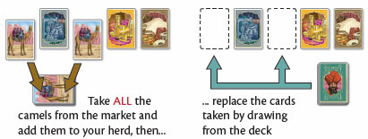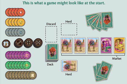 Take the first two cards from the deck and place them face up next to the camels. (There may well be 1 or 2 camels drawn). The market is now ready.