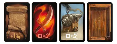 Treasures modify a player's score at the end of the game (cursed treasures negatively). They are placed facedown by a player's holds and only revealed at the end of the game.