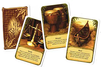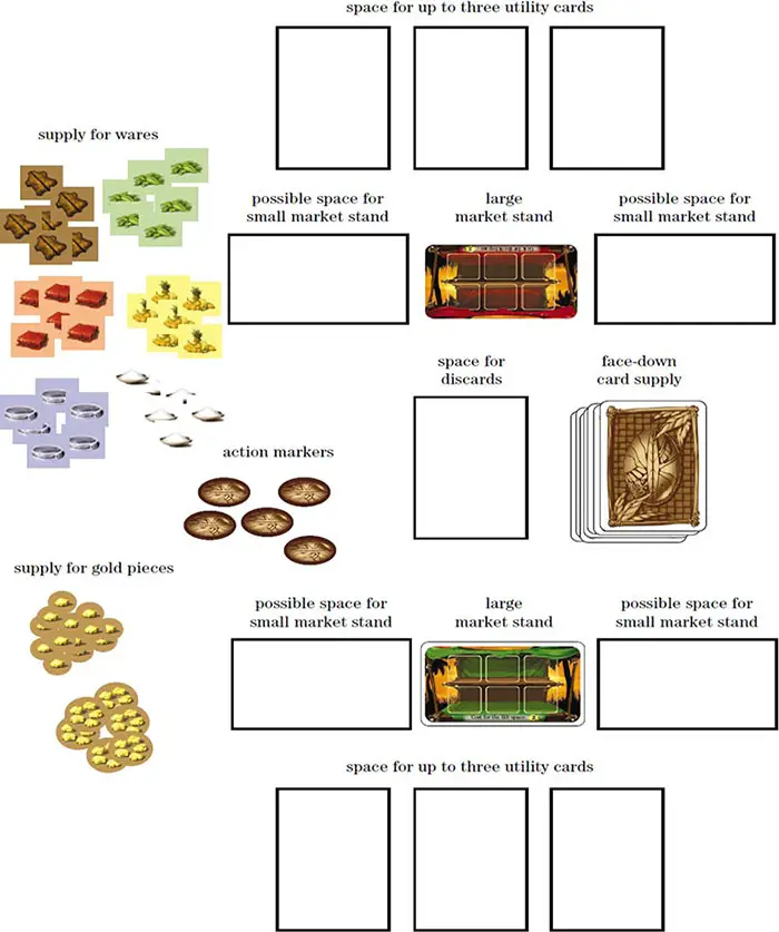 Each player owns a large market stand, on which he displays his wares. During the game, the players can acquire small market stands to enable them to show and sell more wares. By playing ware cards, players can buy wares from the supply to place on their market stands.