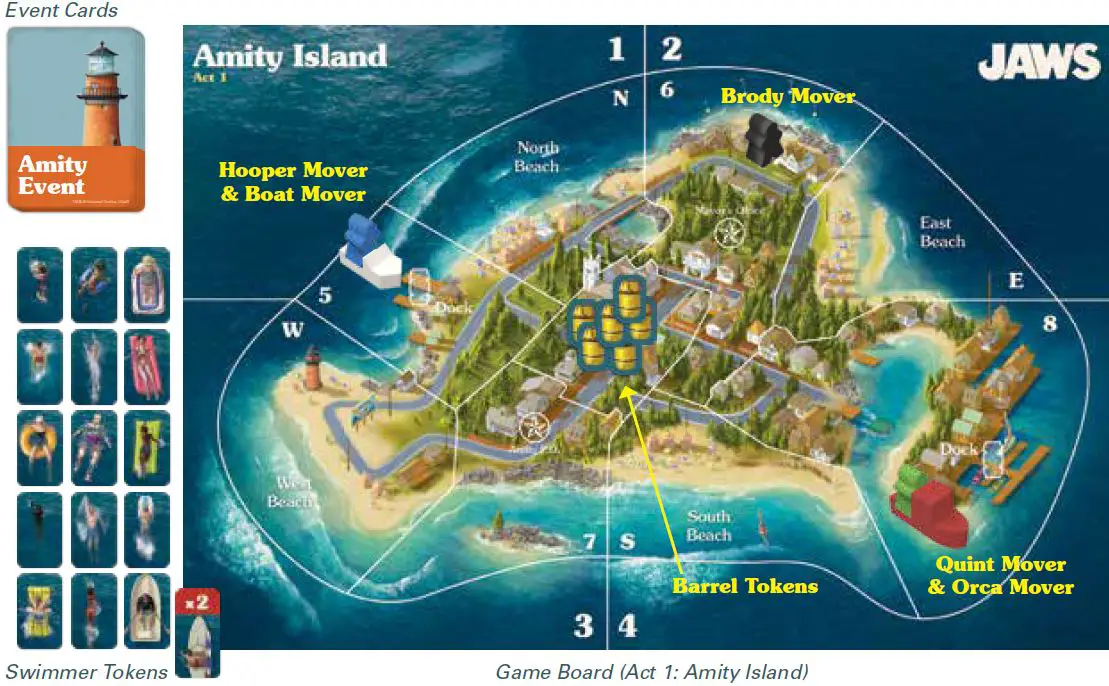 Quint: Take two Barrel Tokens and place them next to your Character Board to indicate they are on the Orca. Place the remaining Barrel Tokens on the Shop (center space). Place the Quint Mover (green) in the Orca Mover (maroon) at the Dock on the eastern side of the island (space 8).