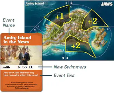 Turn over the top card of the Amity Event deck and place Swimmers from the supply into the water of the Beach Spaces according to the letters shown next to the Swimmer icon.