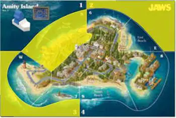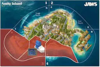 Unfold the game board and place it with the Amity Island: Act 1 side showing. The game board has spaces, separated by white lines.