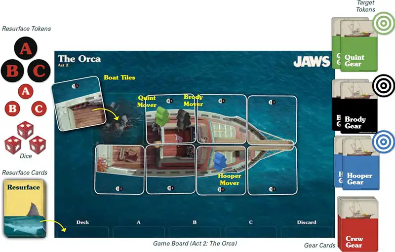 Act 2 occurs on Quint's boat, the Orca. Each round, the Crew Members select weapons and try to predict where the Shark is going to appear. Then the Shark resurfaces, attacking the boat and Crew before diving out of sight.