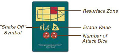 Announce which Crew Member you are attacking, then roll the number of dice shown on the Resurface card. The Crew Member takes one Wound for each Hit rolled. The Crew Member slides the clip on their Wound Track one slot for each Wound taken.