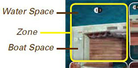 At the start of Act 2, each zone has two spaces-a Boat Space and a Water Space. After a Boat Tile is destroyed (removed from the game), that zone will only have one large Water Space. The borders of all spaces are defined by white lines and tile edges.