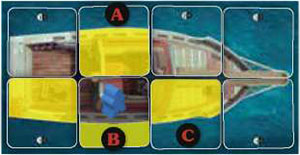 Adjacency Example #2: One Boat Space has been damaged (C) and another has been destroyed (A). Hooper is now adjacent to two Boat Spaces and three Water Spaces because his space shares a border with all of them.