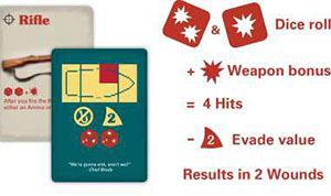 Attack Example: Hooper is attacking with his Rifle. He rolls two dice and gets 3 Hits. Because the Rifle has + W he adds 1 extra Hit, bringing the total to 4 Hits. The Shark has an Evade value of 2, so the attack is successful.