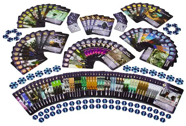 For your first game , randomly give each player one of the four preset hands of 5 cards, marked A, B, C, or Din their upper right and lower left corners. Shuffle the remaining game cards to form the draw pile.In later games , shuffle all game cards and deal each player 7 cards. Players each choose 2 cards to discard face down, ending with an initial hand of 5 cards.