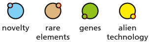 Some cards refer to certain colors of worlds in your empire (see icons at right). Non-gray worlds are blue, brown, green, or yellow, representing production associated with Novelty, Rare Elements, Genes, or Alien Technology goods.