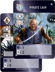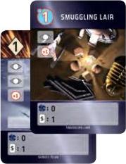 Round 1: Joe takes a Survey Team from the center and places a card face down. After the other players are ready, he flips it over to reveal a Smuggling Lair, a 1 defense world that Joe can place with the Survey Team's 1 military. Joe then discards 1 card to pay for the Survey Team and draws 2 cards income, ending at 5 cards in hand.