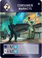 Round 2: Joe places Consumer Markets , discarding just 1 card for it (not 2), as he did not place a world this turn. He earns 1 VP this round and his income increases to 3. He ends with 6 cards in hand.