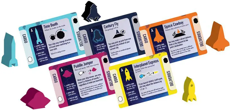 Interplanet Express: Speedy rocket ship sponsored by Earth. If you launch SOURCE: EARTH junk, you may adjust the distance by +1 or -1. Your junk and ship must still travel an equal distance. If you launch a "1" junk tile, you may reduce that to "0" and stay in place for that turn, picking up junk from your current city.