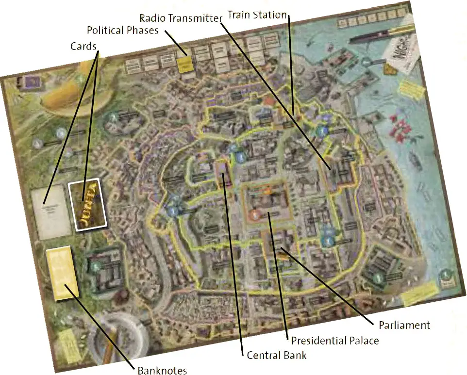 The map of the island is only required during a Coup d'État. The neighborhoods, army bases, police precincts, embassies, and the five Important Power Centers are clearly demarcated locations.