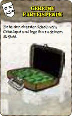 Secret Party Donation cards are discarded in exchange for the top bill in the Development Aid deck.
