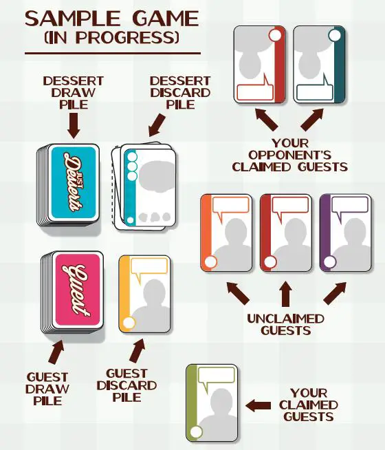 Shuffle the Dessert deck and deal three Dessert cards to each player. Then shuffle the Guest deck and deal out three Guest cards, placing them face-up in the center of the table.